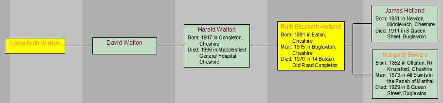 Above are five generations connecting Lorna Ruth to Ruth Elizabeth Holland (the fourth Ruth) - there are four generations between the two Ruths. I have called Ruth Elizabeth the fourth Ruth based on her year of birth (1891) when she was the fourth known Holland to be called Ruth.