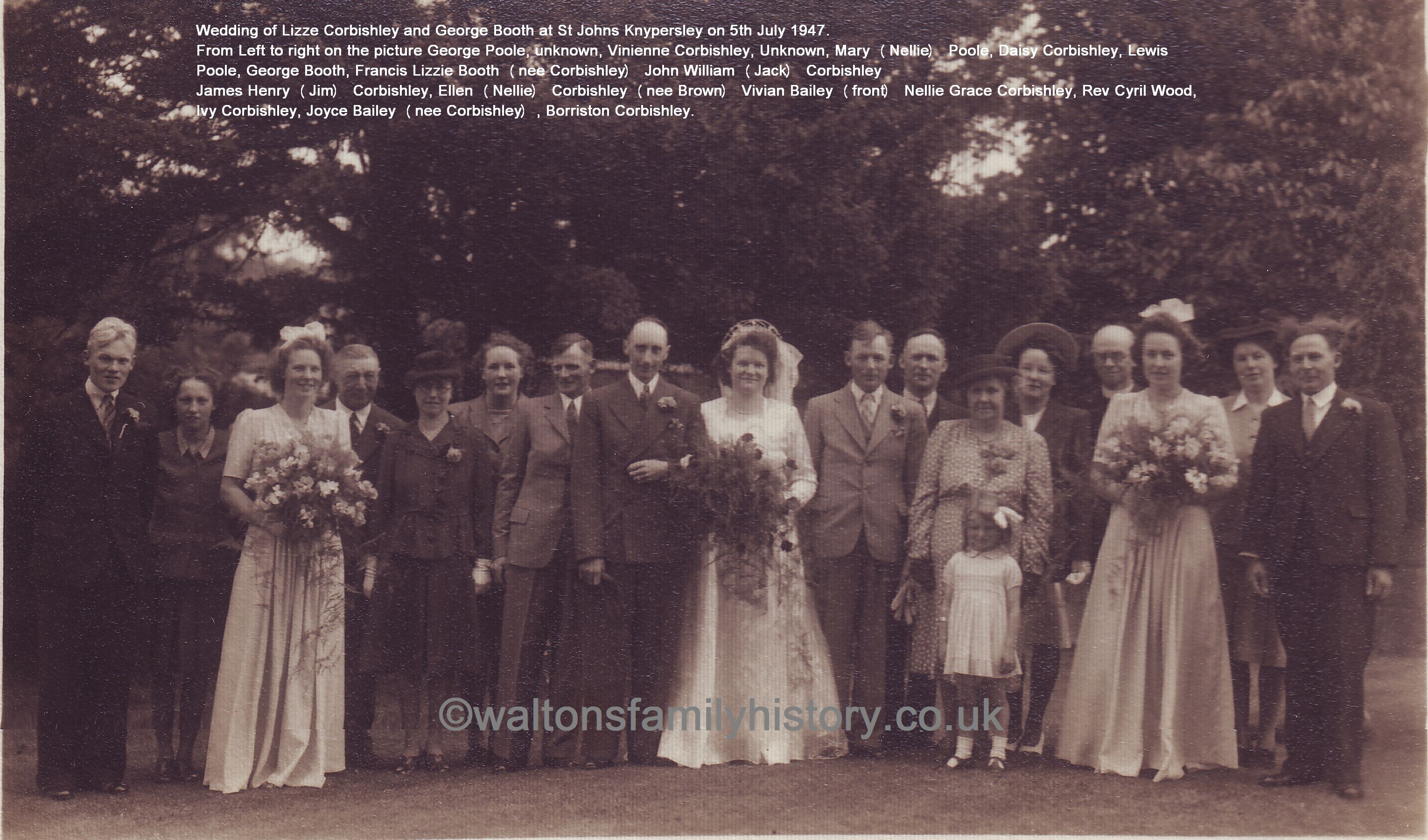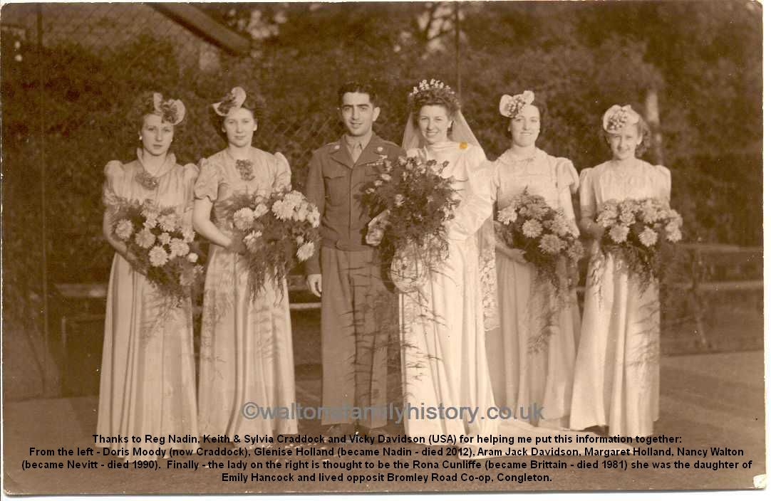 ![]() Wedding photograph ouside 115a Astbury Street Congleton. From left Ada Lancake (Knapper) Ruth Walton (Holland) Nancy Walton, Harold Waton, Ada Yates, Julia Yates, James Yates |